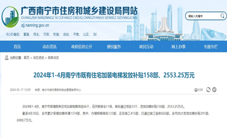 近日,,,,据南宁市住房和城乡建设局消息,,2024年1到4月,,,,南宁市受理既有住宅加装电梯项目66个,,,召开联审会11场,,审批通过项目33个,,,发放加梯补贴158部、、、、2553.25万元。。。。 截至4月30日,,全市累计受理加梯申请1374部,,,,其中,,,,办理前期审批133部,,,正在施工415部,,,已通过竣工验收826部。。。全市共计发放加梯补贴391部、、、6900.7万元。。
